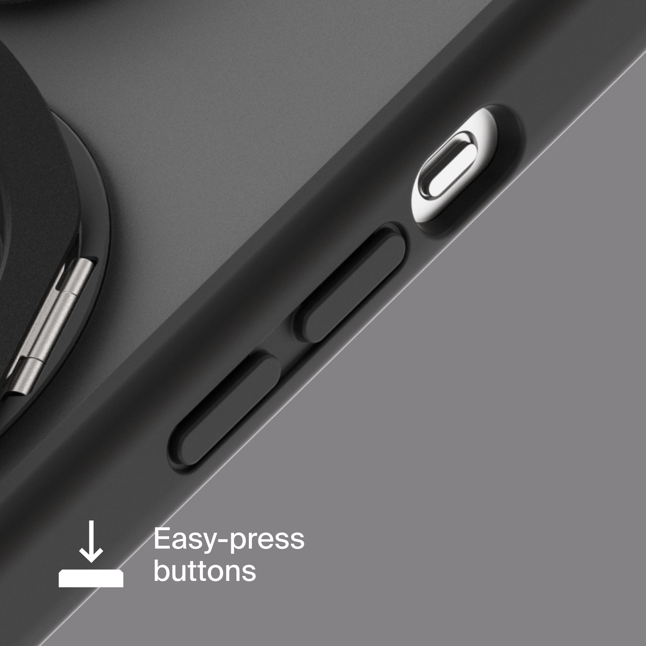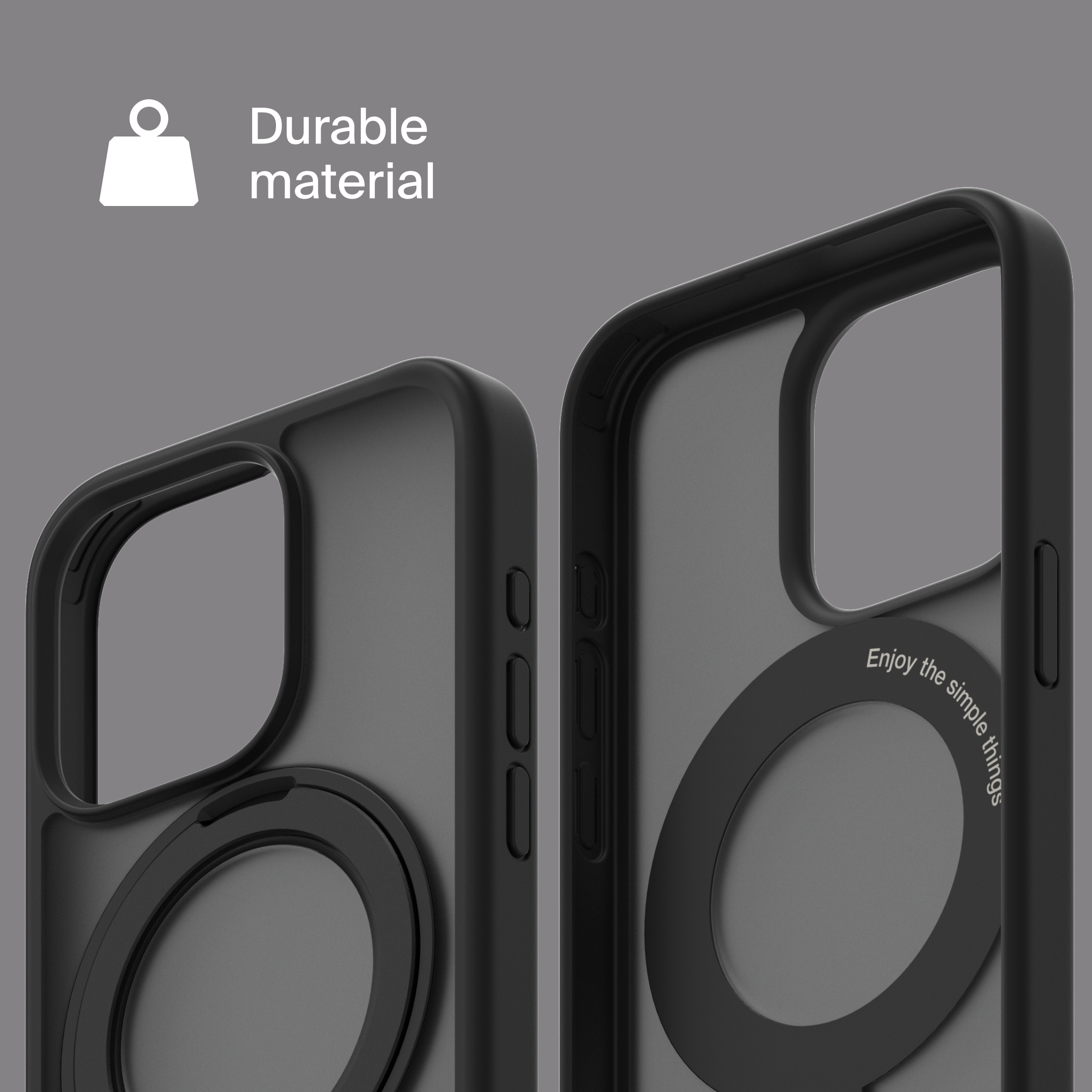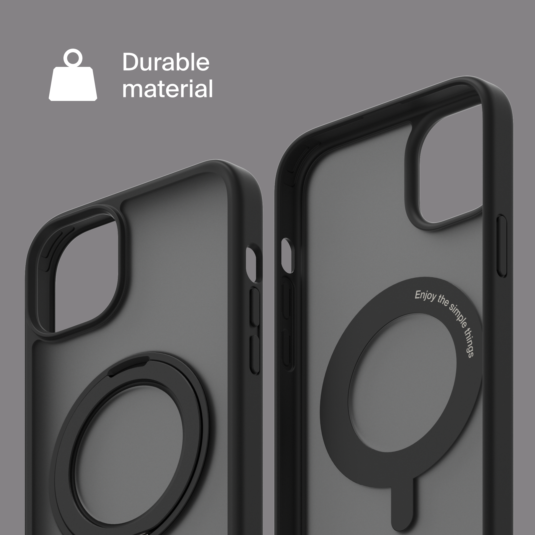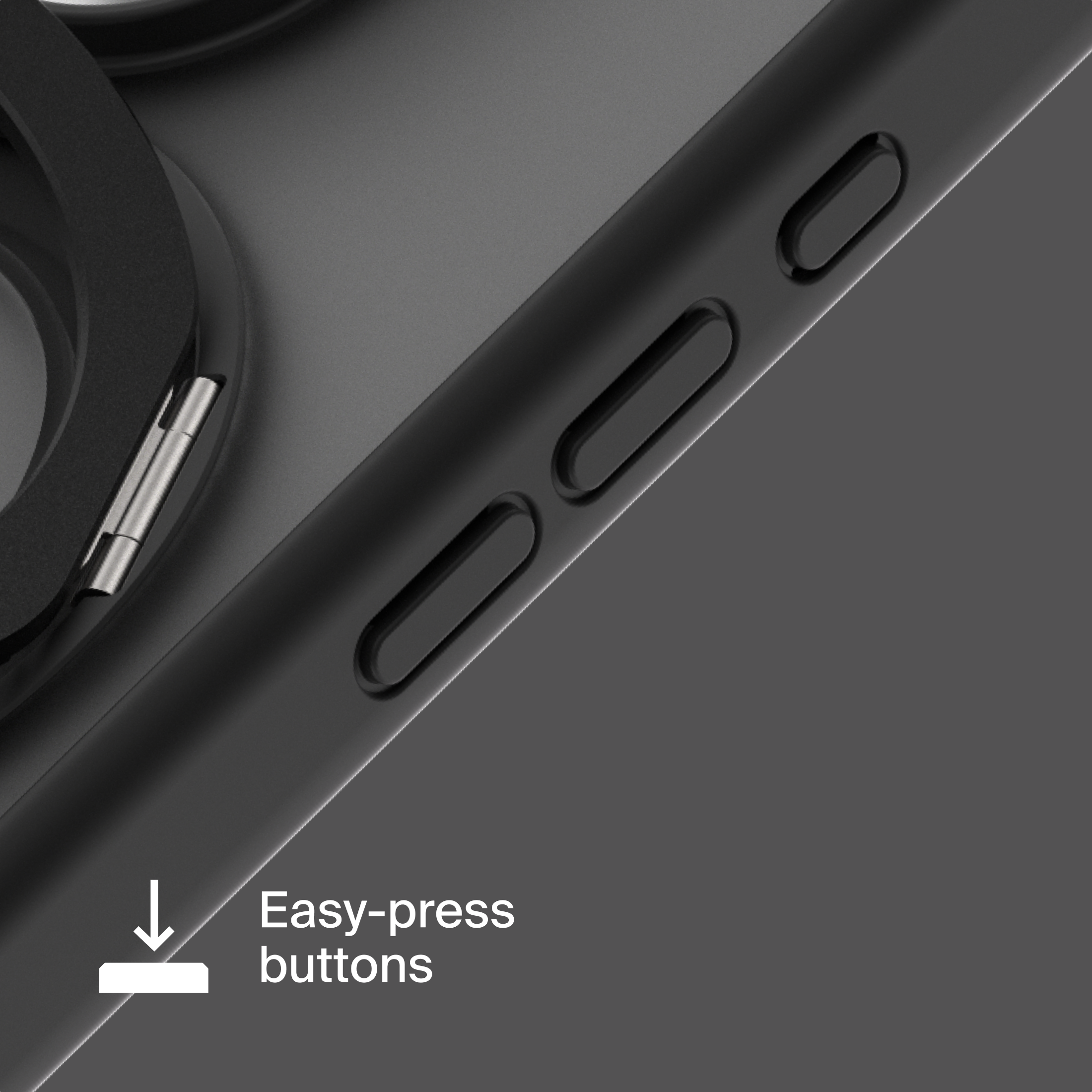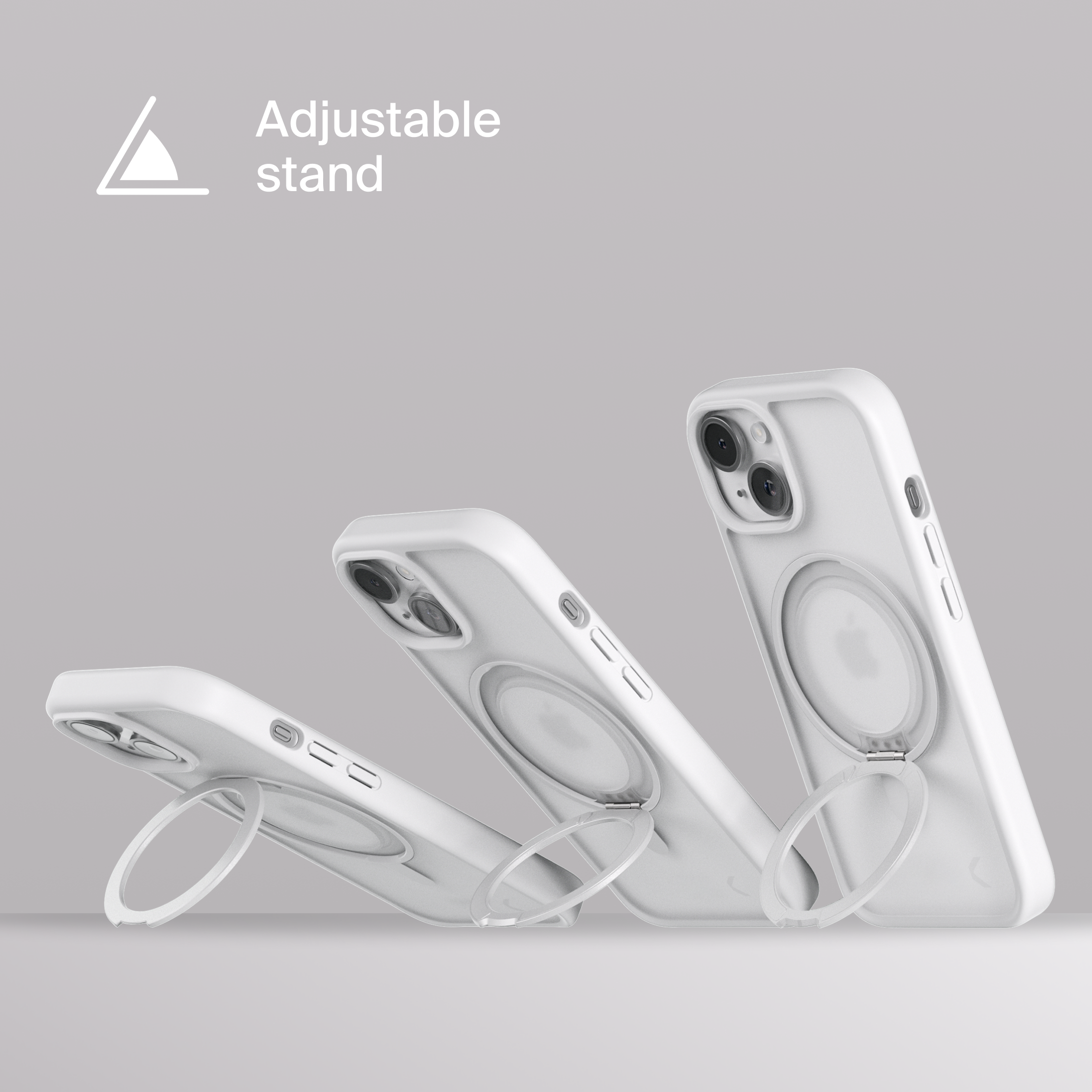 A durable aluminum ring with built-in magnets and a special hinge firmly holds your phone in any position — vertical or horizontal. The scratch-resistant ring is comfortable to hold and doubles as a secure stand for everyday use.